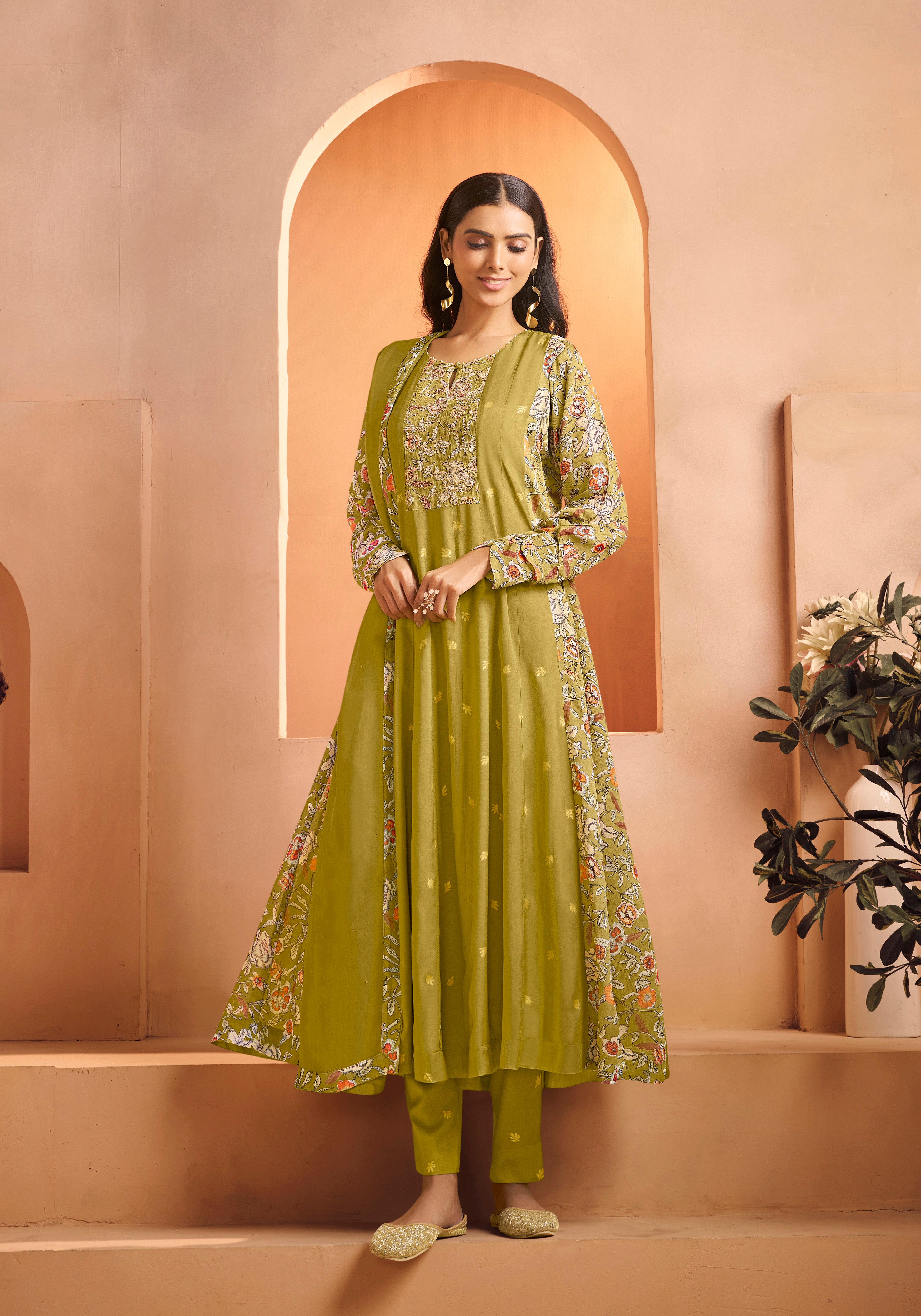 Celebrate in style with this green silk salwar suit, featuring elegant machine embroidery, a sleek anarkali cut, and a refined round neck —graceful and timeless.