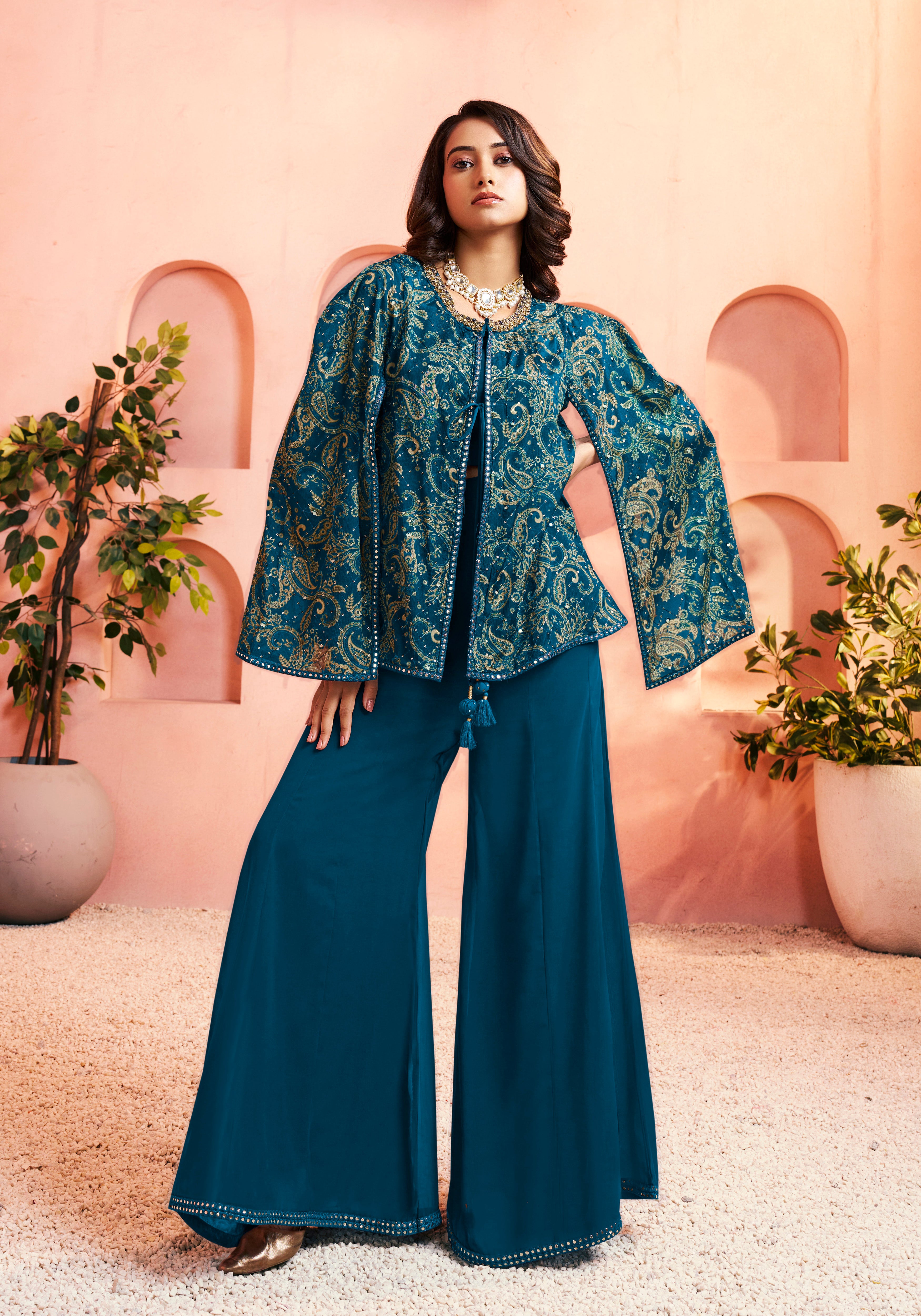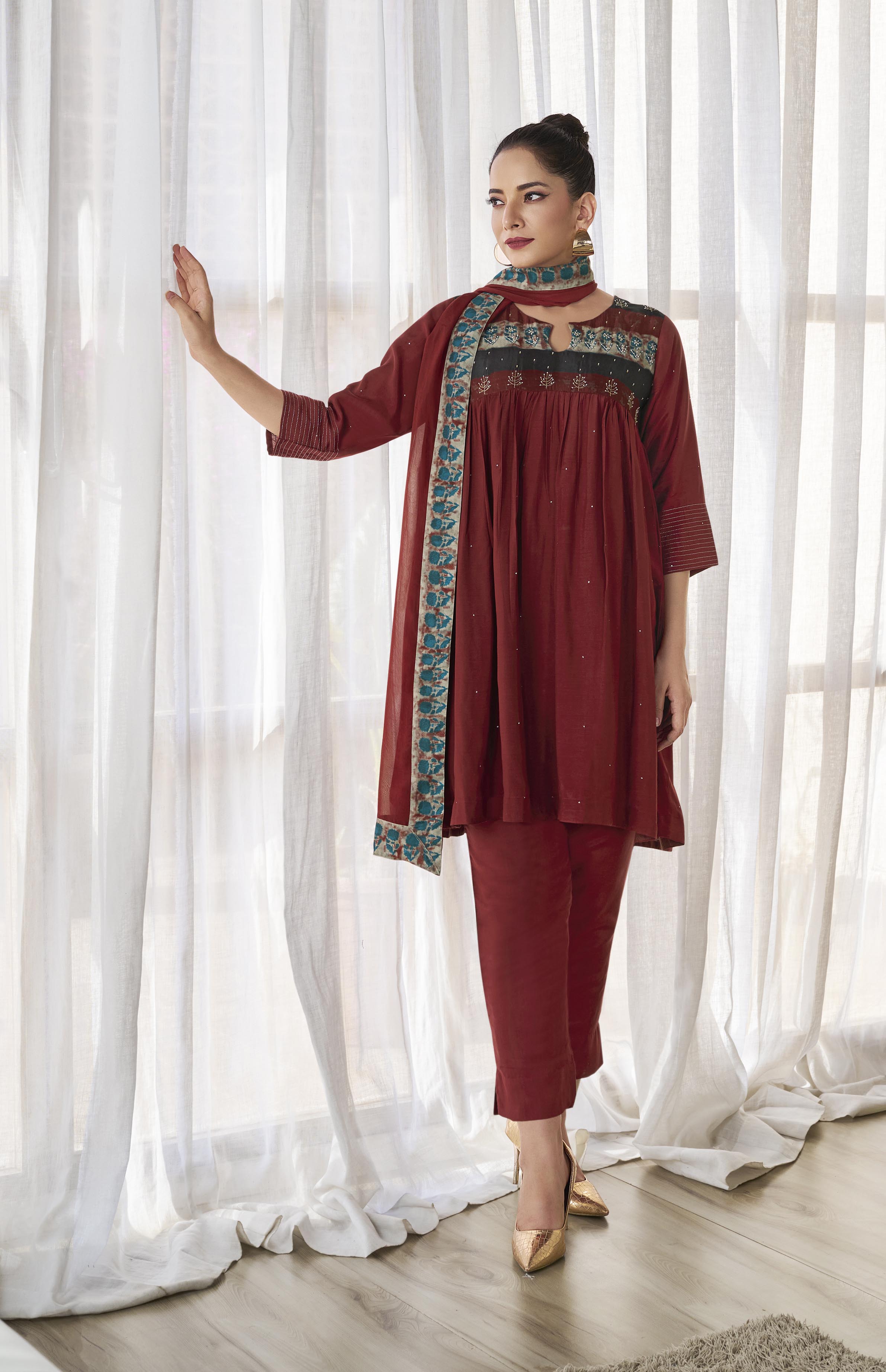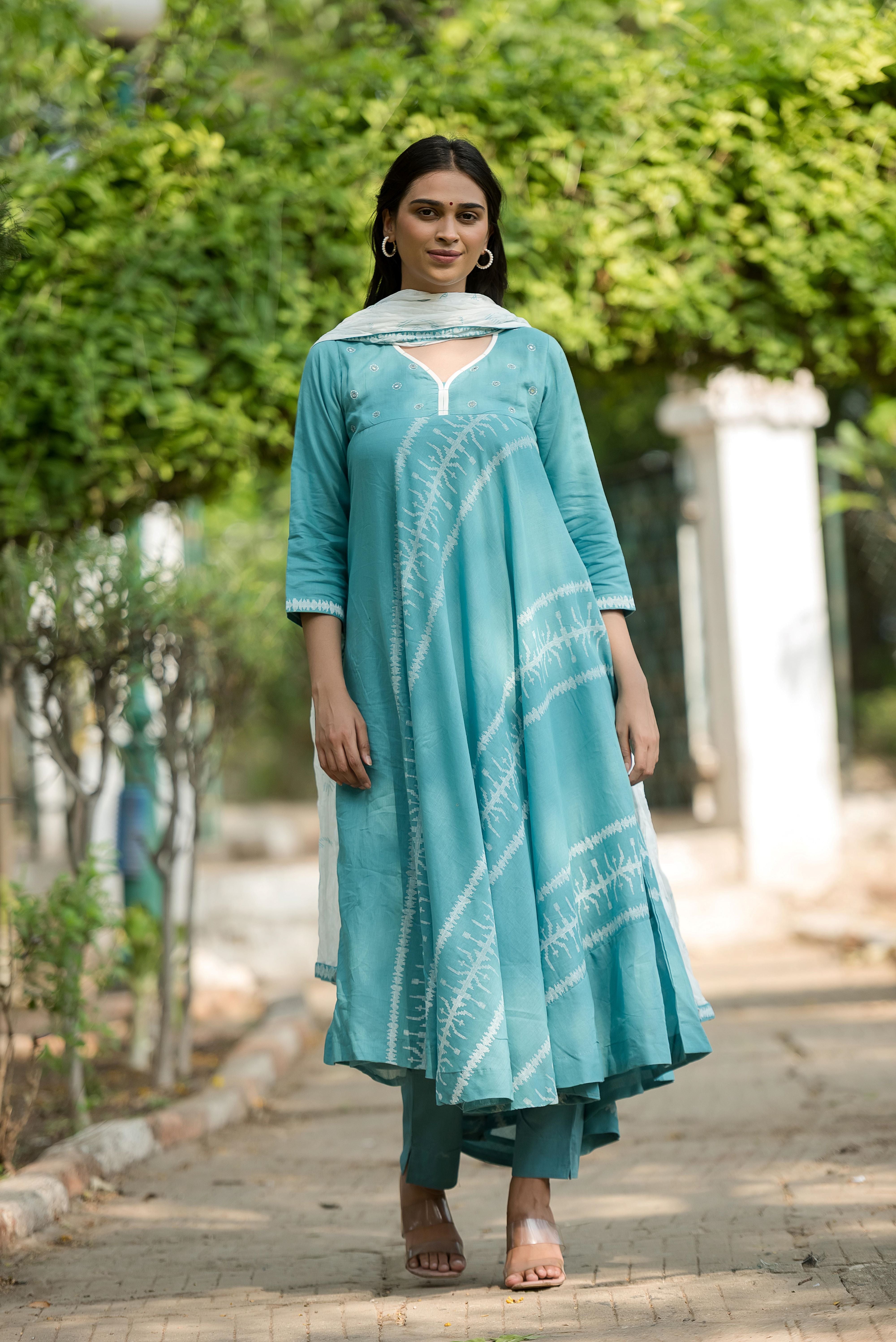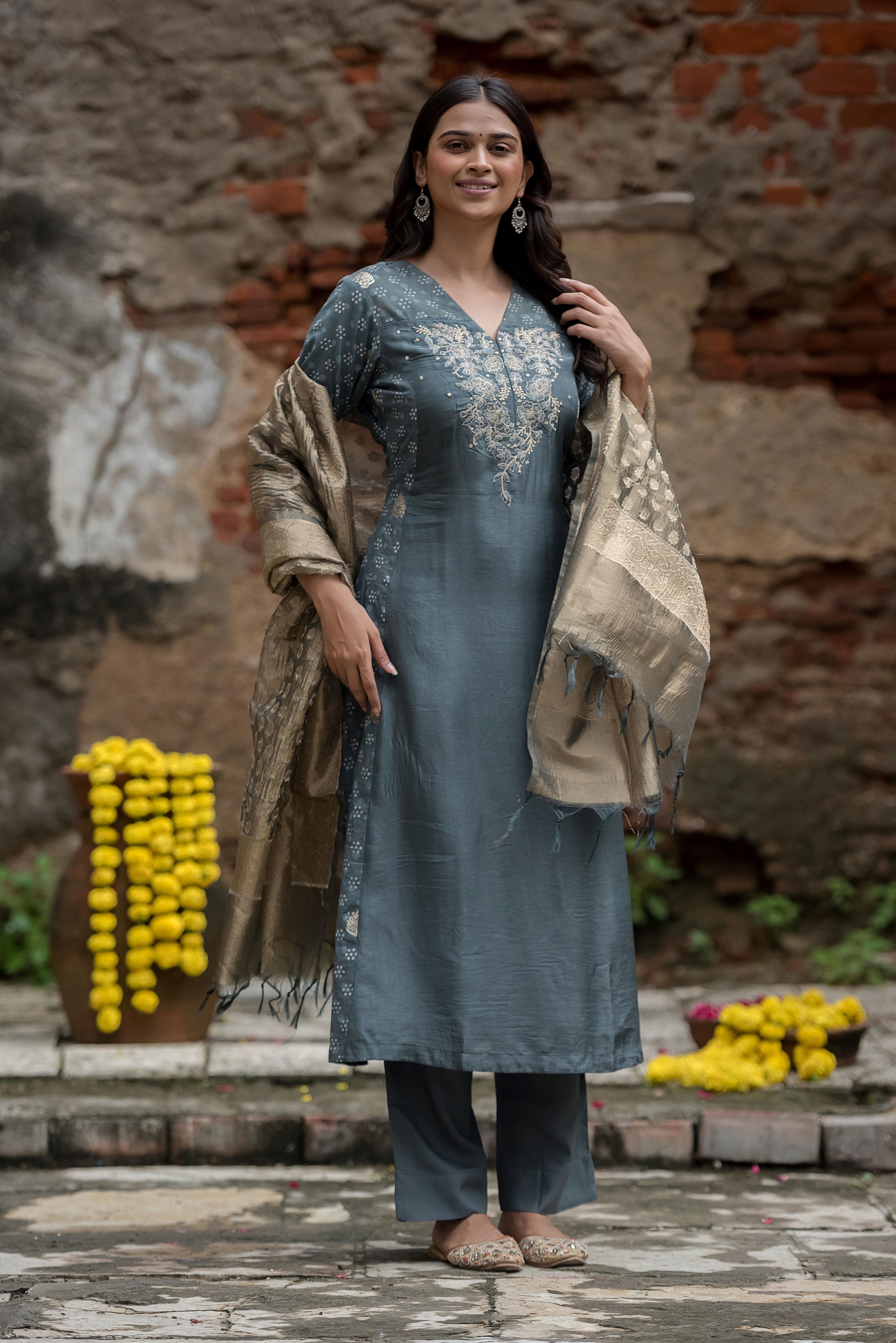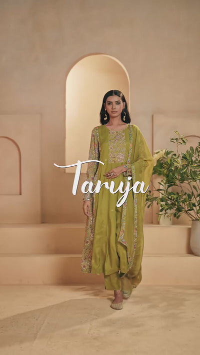 Celebrate in style with this green silk salwar suit, featuring elegant machine embroidery, a sleek anarkali cut, and a refined round neck —graceful and timeless.