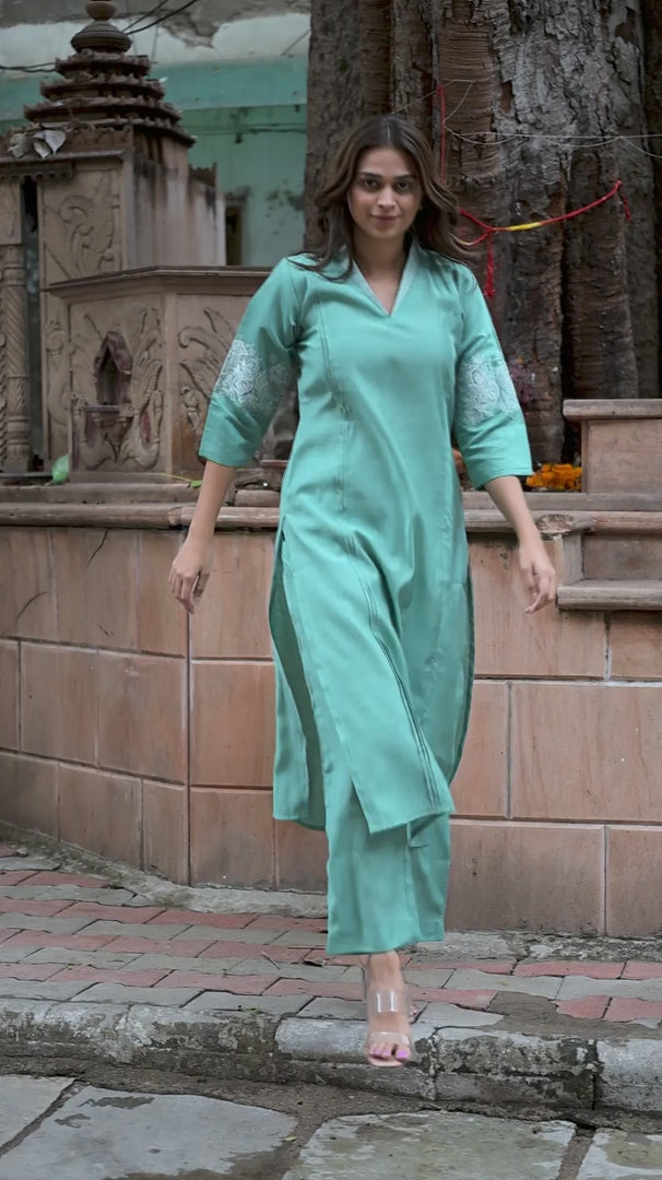 In rich green silk, this straight co-ord set features a refined V-neckline, regular sleeves, and delicate co-embroidery, reflecting timeless elegance with modern ease.