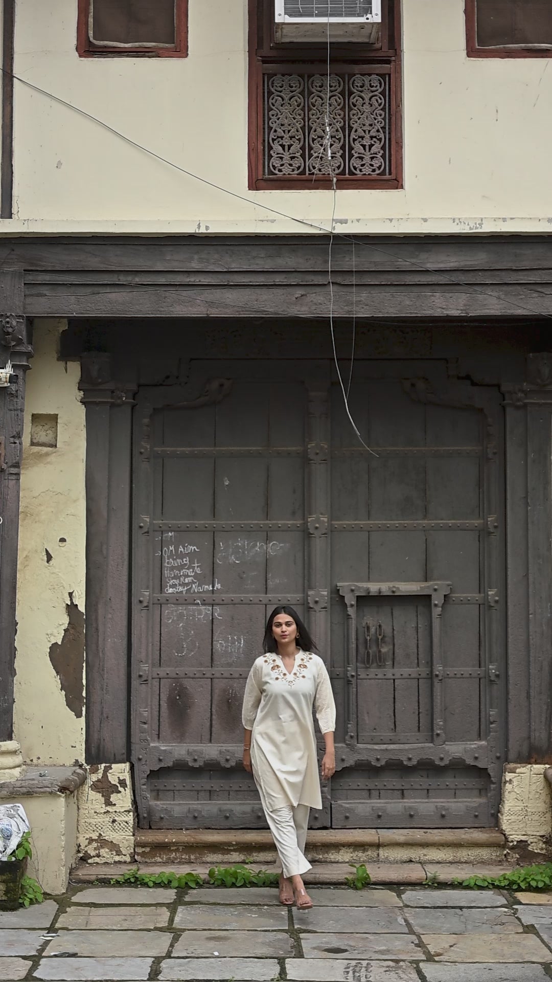 Beige Straight Apple Co-ord Set, exquisitely designed with intricate co-embroidery accents, featuring a chic V-neckline and graceful balloon sleeves — a statement of modern elegance.