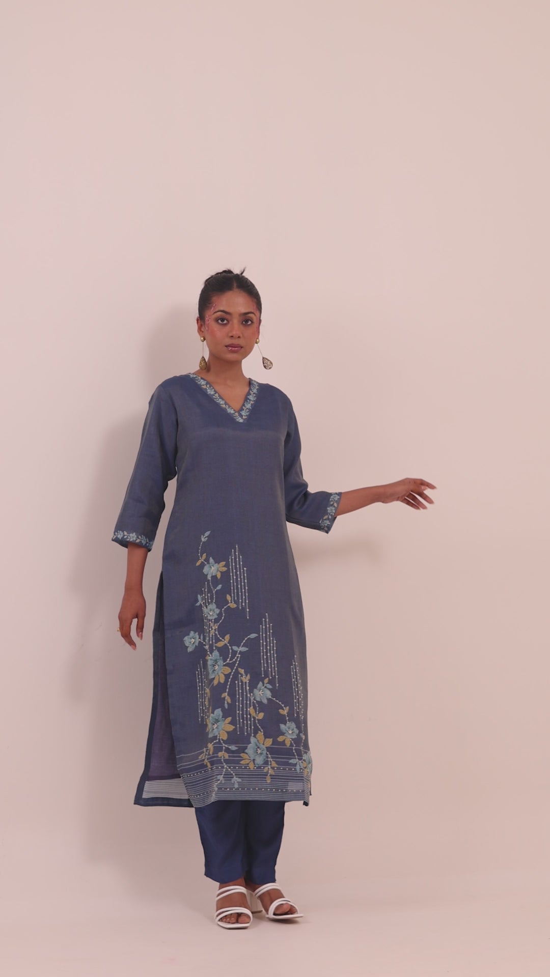 An elegant soft linen tissue kurta set, adorned with artistic digital placement prints and refined hand