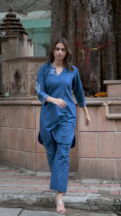 In blue hues, this straight set features a refined V-neckline, regular sleeves, and intricate co-embroidery, offering the perfect harmony of comfort and elegance.