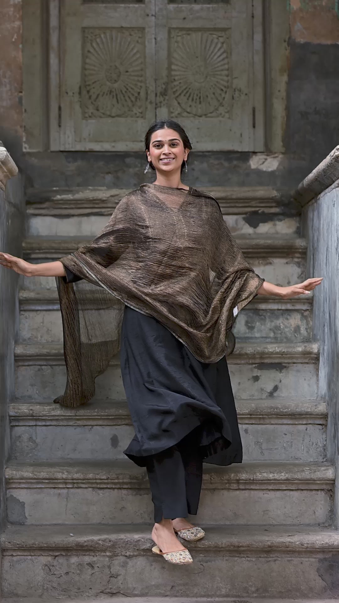 Understated elegance in black—A-line cut with M.Emb + khat work and a sharp V-neck.
