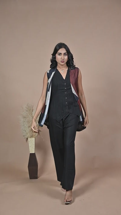 In a classic black hue, this sleeveless co-ord set with a chic V-neckline embodies timeless elegance and modern sophistication.