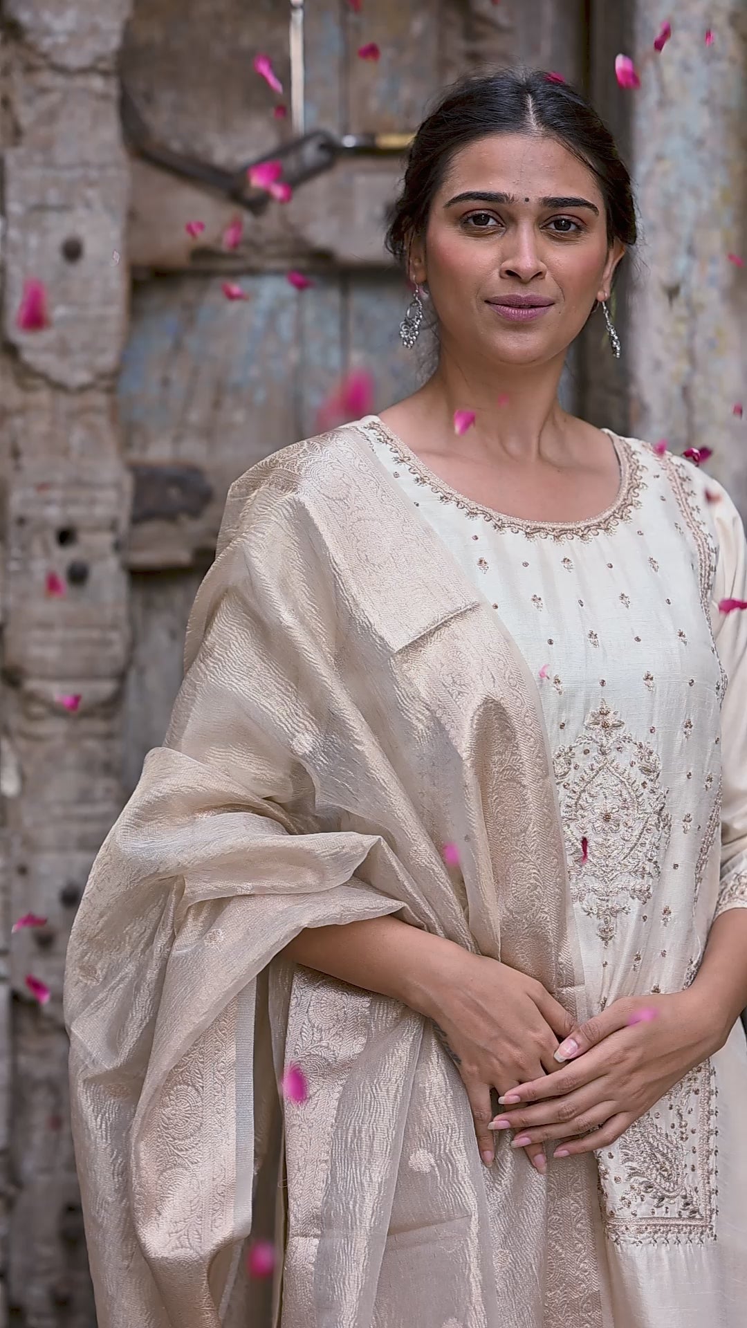 Cream Silk Straight-Cut Suit Featuring Delicate Khat Work and a Gracefully Rounded Neckline