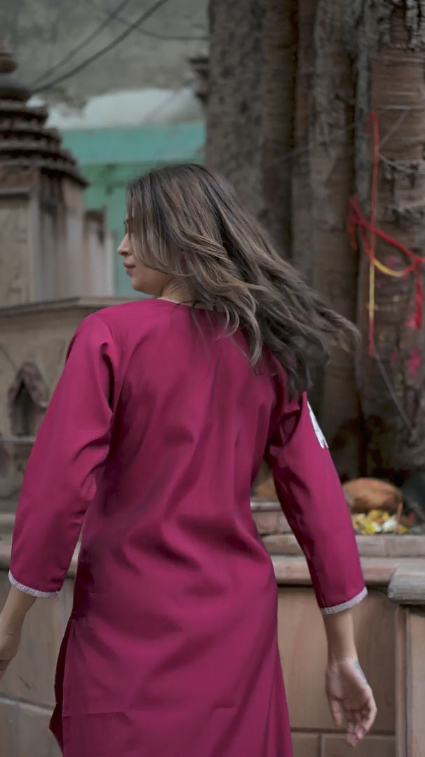 In dark pink hues, this straight set features a refined V-neckline, regular sleeves, and intricate co-embroidery, offering the perfect harmony of comfort and elegance.