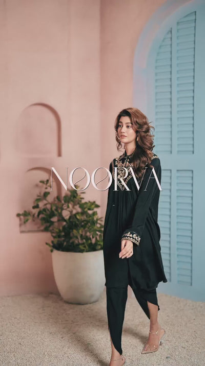 Turn heads in this black co-ord set, detailed with intricate accents, a crisp collared neckline, and full sleeves for effortless sophistication.