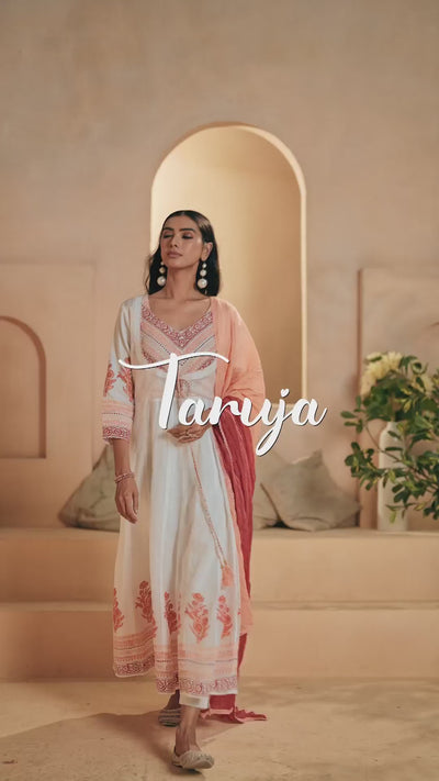 Glow in this white malmal flair salwar suit, showcasing intricate block and khat work, flair cut, and a stylish round V-neck.
