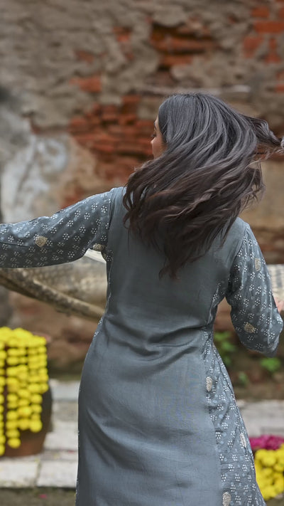 A-line elegance in grey with delicate machine embroidery and a clean round neck.