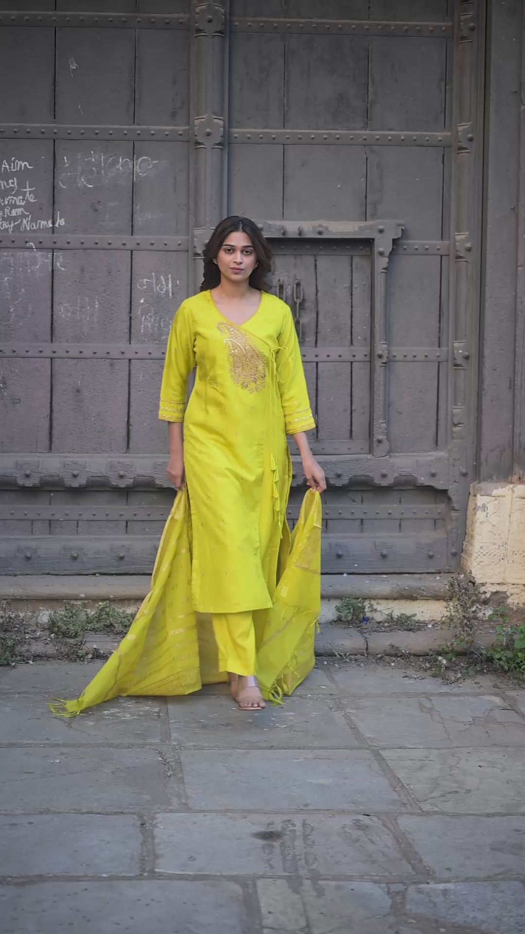 Made from rich Dola silk, this lemon Angrakha suit set features a V-neckline finished with subtle khat work detailing.