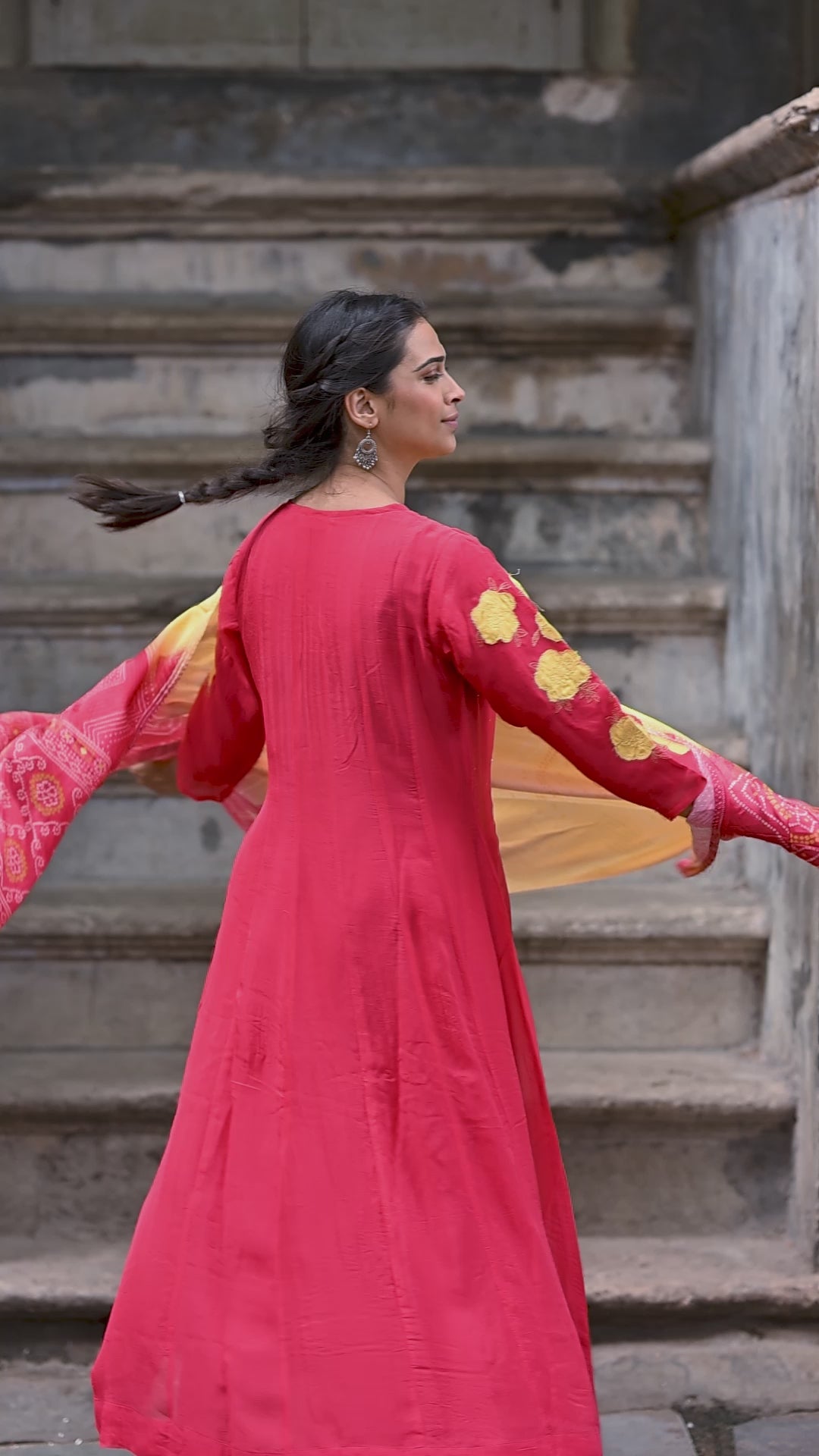 Exude elegance in this stunning pich Armanni salwar suit, showcasing a regal Anarkali silhouette, intricate machine embroidery, and a graceful round V-neckline—perfect for special occasions with a touch of timeless charm.