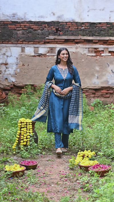A graceful straight-cut rama suit adorned with delicate khat work and a refined roll-out collar for a modern, polished look.