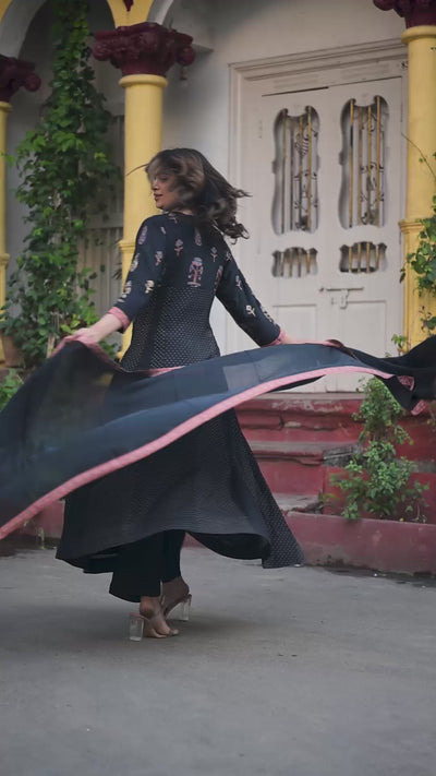 Crafted in rich Dola silk, this black flared suit set showcases a stand patti neckline adorned with delicate khat work detailing.