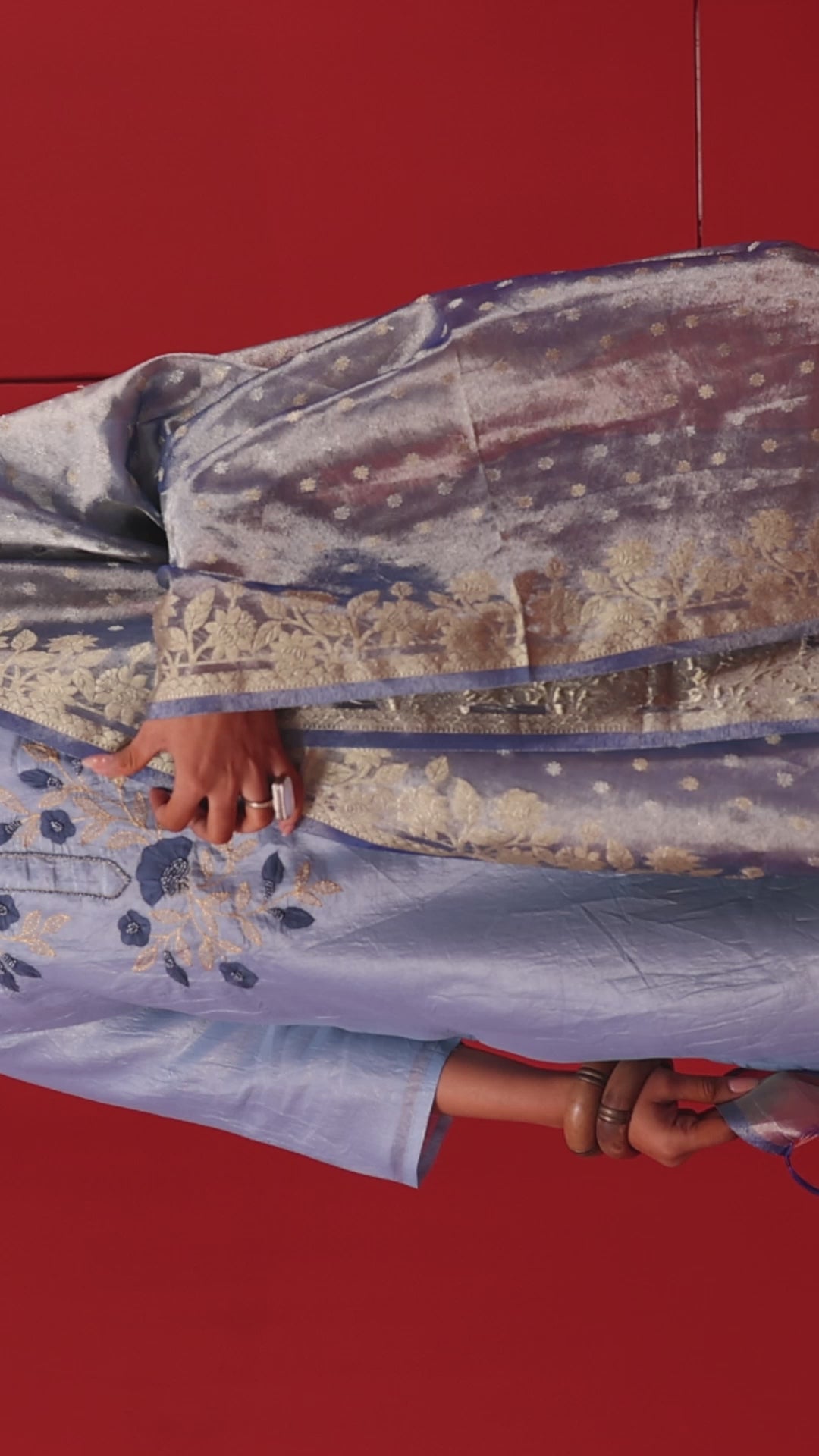 A refined Steel Blue Crush Tissue Kurta Suit Set, adorned with intricate applique handwork and elegant Zardosi Khatwork. Paired with a graceful Tissue Banaras Dupatta, this ensemble embodies timeless sophistication.